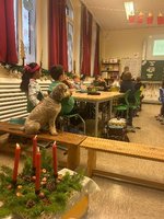 Während des Unterrichts bin ich oft einfach da und schaue zu, was die Kinder gerade lernen. Manchmal darf ich durch die Reihen gehen und werde gestreichelt – das mag ich sehr! Wenn die Kinder besonders spannende Sachen machen, wie das „Ohrenkino“, dann liege ich mittendrin und höre aufmerksam zu.